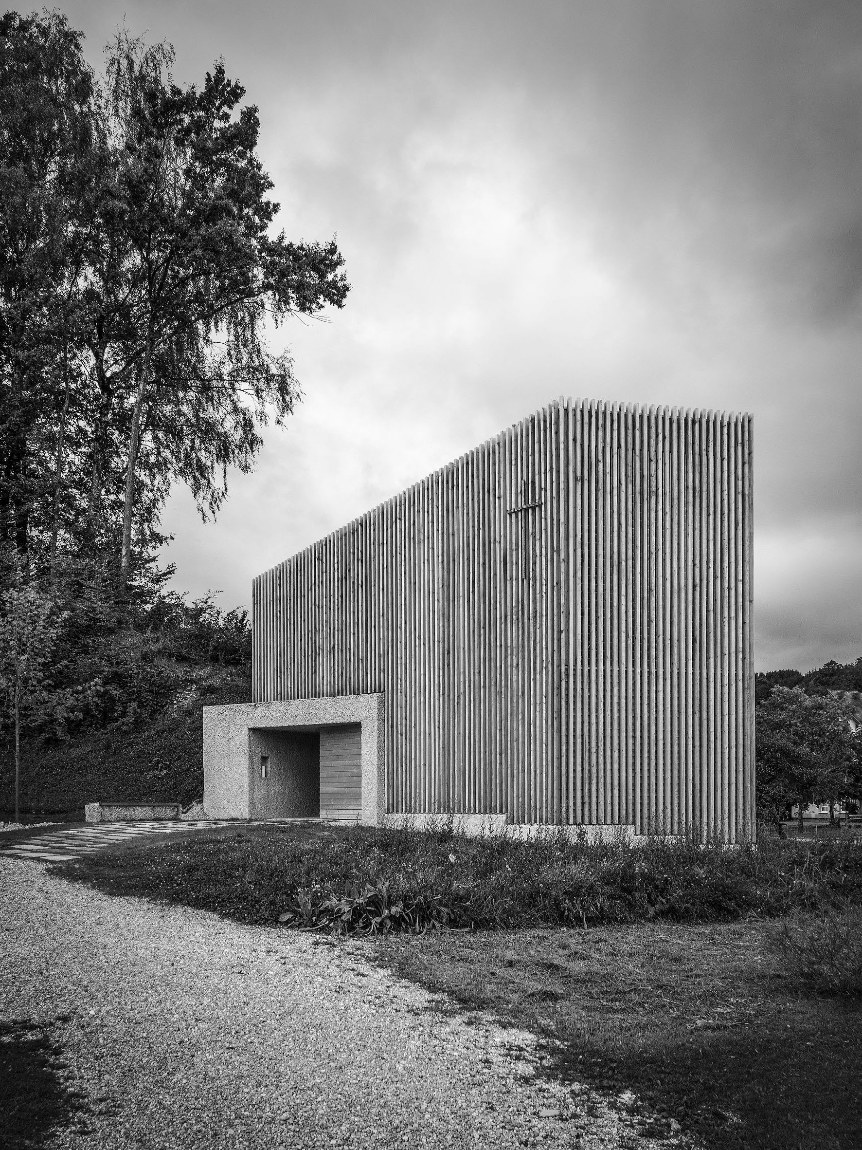 Die Kapelle steht auf einem leichten Abhang, was der Architekt genutzt hat, um der Kubatur des Bauwerks eine fast natürlich erscheinende Überhöhung zu geben, zugleich wirkt die vertikale Holzlattenverkleidung profan. Es ist das durchscheinende Licht in der oberen Ebene, das auf den Lichtgaden als traditionelles Kirchenelement hinweist und auch schon moderne Auslegungen erfahren hat, zum Beispiel bei Rudolf Schwarz’ Pfarrkirche Keferfeld in Linz. Gleichwohl ist einiges anders.