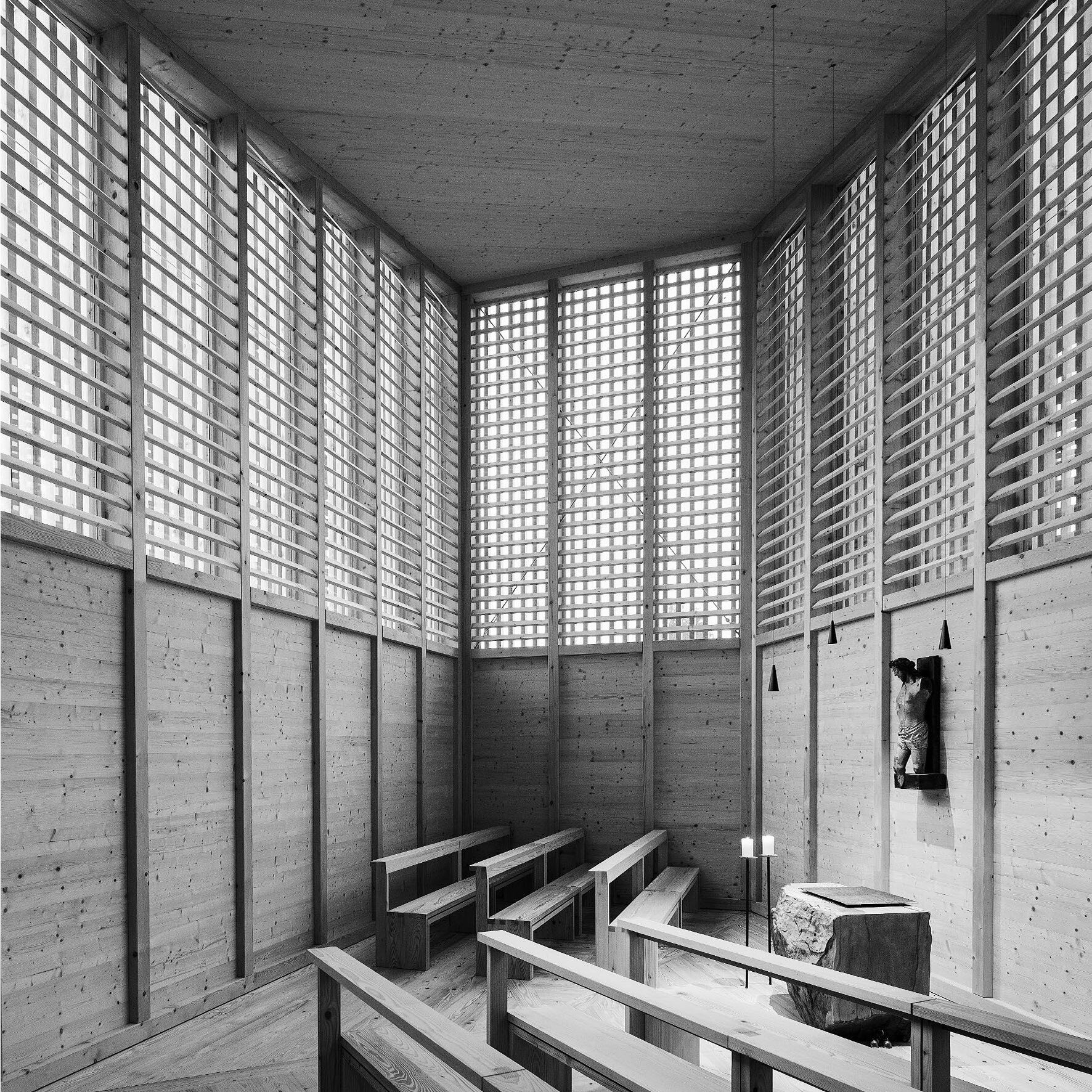 Man betritt den Innenraum seitlich. Dieser ist zugleich nicht entlang der Längsachse orientiert, sondern entlang der Querachse. Die Sitzreihen entfalten sich in die Breite und rücken allesamt nahe an den Altar heran. Und das ist offenbar die Botschaft des Hauses: Nähe, Zugehörigkeit und Offenheit (auch für Nicht-Gläubige oder andere Glaubensrichtungen). Alles ist deshalb klar und ohne Auratisierung gestaltet: der vertikale Rhythmus der Fichtenvollholzkonstruktion sowie die sekundäre Ordnung der horizontalen Latten bzw. Lamellen, die langgestreckten Sitzbänke aus Tannenholz, die eine räumliche Einheit mit dem Boden aus demselben Holz bilden, sowie die wenigen Einzelelemente, die exakt dort platziert sind, wo sie hingehören. Das sind neben einigen filigranen Hängelampen, die genau bis zum unteren Ende des Lichtgadens reichen, vor allem eine antike Christusskulptur sowie ein besonders schöner, grauer Sandsteinblock als Altar, der nur an den notwendigen Stellen vom Steinmetz behauen und poliert wurde. (Sowohl die Skulptur als auch der Stein sind private Schenkungen mit je eigener Geschichte.)
