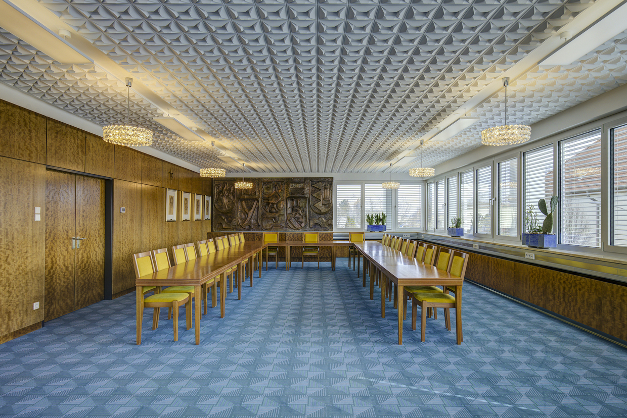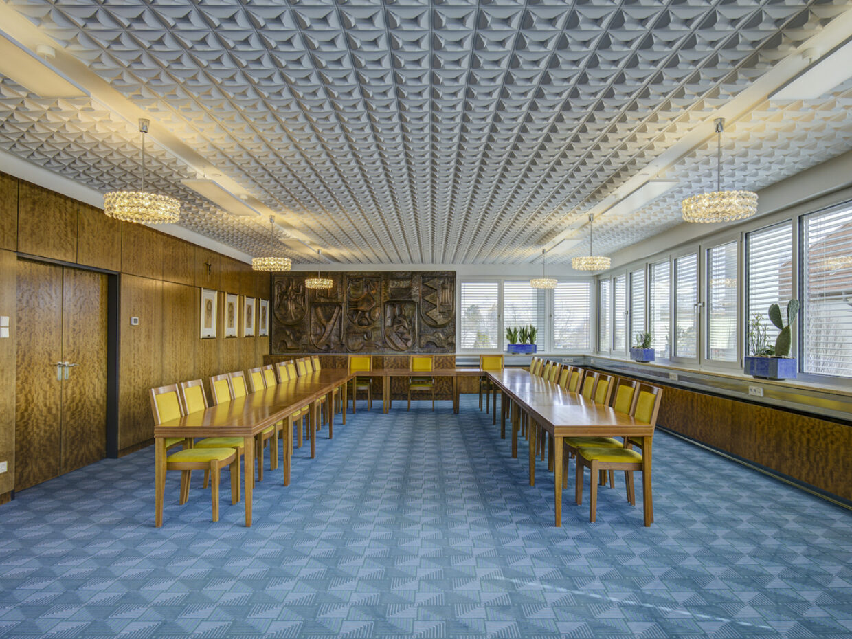 Teppich, Travertin, Holzpaneele aus Makoré, eine Kassettendecke aus gegossenem Gips, dazu Kristallluster aus der Nachkriegszeit. Es ist, als wäre man mit der Zeitmaschine ein halbes Jahrhundert in die Vergangenheit zurückgereist. „Prinzersdorf hat sich 1950 von Gerasdorf abgespalten und wurde damals eine eigenständige Gemeinde“, sagt Bürgermeister Rudolf Schütz. „Diese neue Identität und der Aufbruchsgeist der Zeit spiegelt sich auch in unserem 1970 errichteten Rathaus wider.“ Nachdem die Haustechnik veraltet und ein weiterer Betrieb ohne Wärmedämmung nicht mehr zeitgemäß schien, wurden Ernst Beneder und Anja Fischer mit der Erstellung einer Studie beauftragt. Es galt herauszufinden, wie man den liebgewonnen Zeitzeugen barrierefrei sanieren könne. Die beiden Architekt*innen untersuchten vier Varianten von soft bis rigoros, die Wahl fiel schließlich auf eine behutsame Sanierung light. Während die Fassade mittels Schaumglas thermisch isoliert und das Haus vom Gas genommen und an ein Nahwärmenetz angeschlossen wurde, beschränkten sich die Arbeiten im Innenraum vor allem auf Instandsetzungen, Wiederherstellungen und technische Ertüchtigung hinter den Kulissen. Zudem wurde im Untergeschoss eine kleine öffentliche Bibliothek eingerichtet. Die radikale Sanierung des Amtshauses ist das Produkt von Liebe, Demut, Suffizienz, Kreislaufwirtschaft und einem respektvollen Umgang mit unseren Ressourcen – und formuliert in einem stillen Protest einen unmissverständlichen Appell an die Gesellschaft.