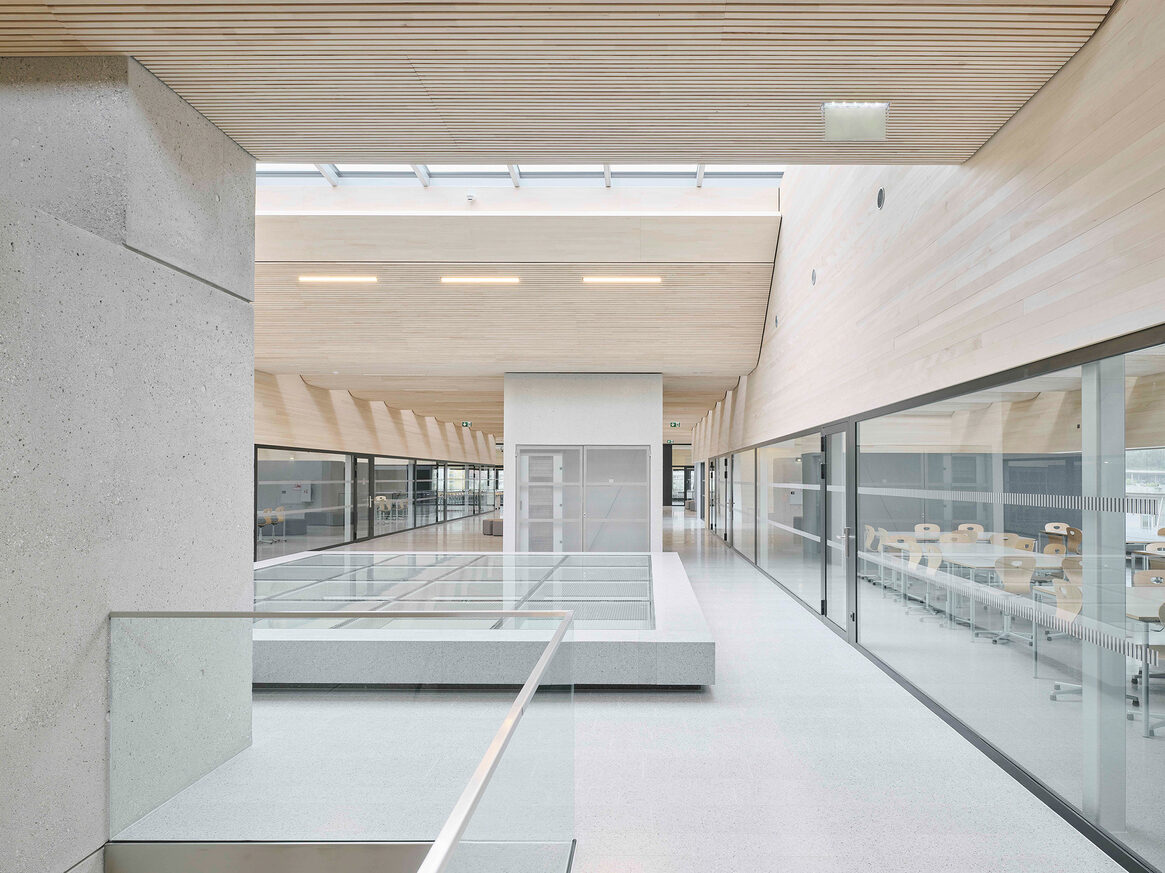 Der Schulkomplex der HTL Bau & Design stammt aus einer Zeit, als beige Fliesen, braune Türen und gelbe Zargen noch in Mode waren. Aus Platzmangel musste der Bestandsbau um eine Etage aufgestockt werden. Das Raumerlebnis, sobald man sich durch die Zeitkapsel des Stiegenhauses hochgearbeitet hat, ist ein himmlisches, von Licht und Leichtigkeit durchflutetes. Die Innsbrucker ao-architekten setzten dem Betonbau ein viertes Stockwerk in Holzleichtbauweise auf. Der natürliche Baustoff ist auch im Innenraum spürbar – einerseits an den Wänden, andererseits an der raffinierten, weich geformten Shed- Dachkonstruktion, die ein angenehm diffuses Licht aus Nordwest einfängt. Die außergewöhnlich große Raumhöhe von 3,60 bis zu über sechs Metern, die nicht nur atmosphärische, sondern vor allem auch thermisch-bauphysikalische Gründe hat, wird man im Neubau so bald kein zweites Mal finden. Umlaufende Fensterbänder offenbaren einen Rundumblick auf ganz Innsbruck. Der Wettbewerb, die hohe Bestellqualität der BIG und das sensible Raumkonzept der Architekten scheinen sich voll gelohnt zu haben: Nachdem sich fast alle Klassen und Lehrgänge gewünscht haben, ins neue Dachgeschoss zu übersiedeln, hat die Schulleitung den Entschluss gefasst, den architektonischen Olymp der HTL den Matura-Schüler*innen zu überlassen. So kommt jeder Schüler, jede Schülerin am Ende der Ausbildung in den Genuss des Neuen. Summa cum laude.