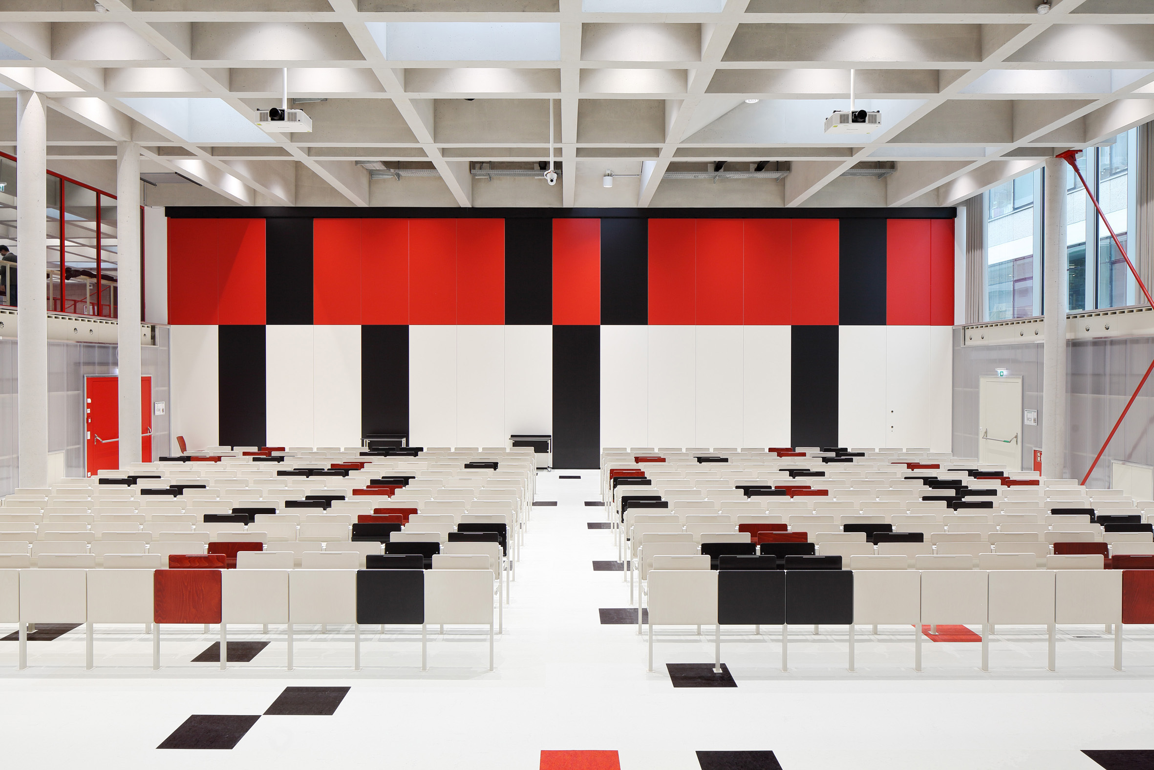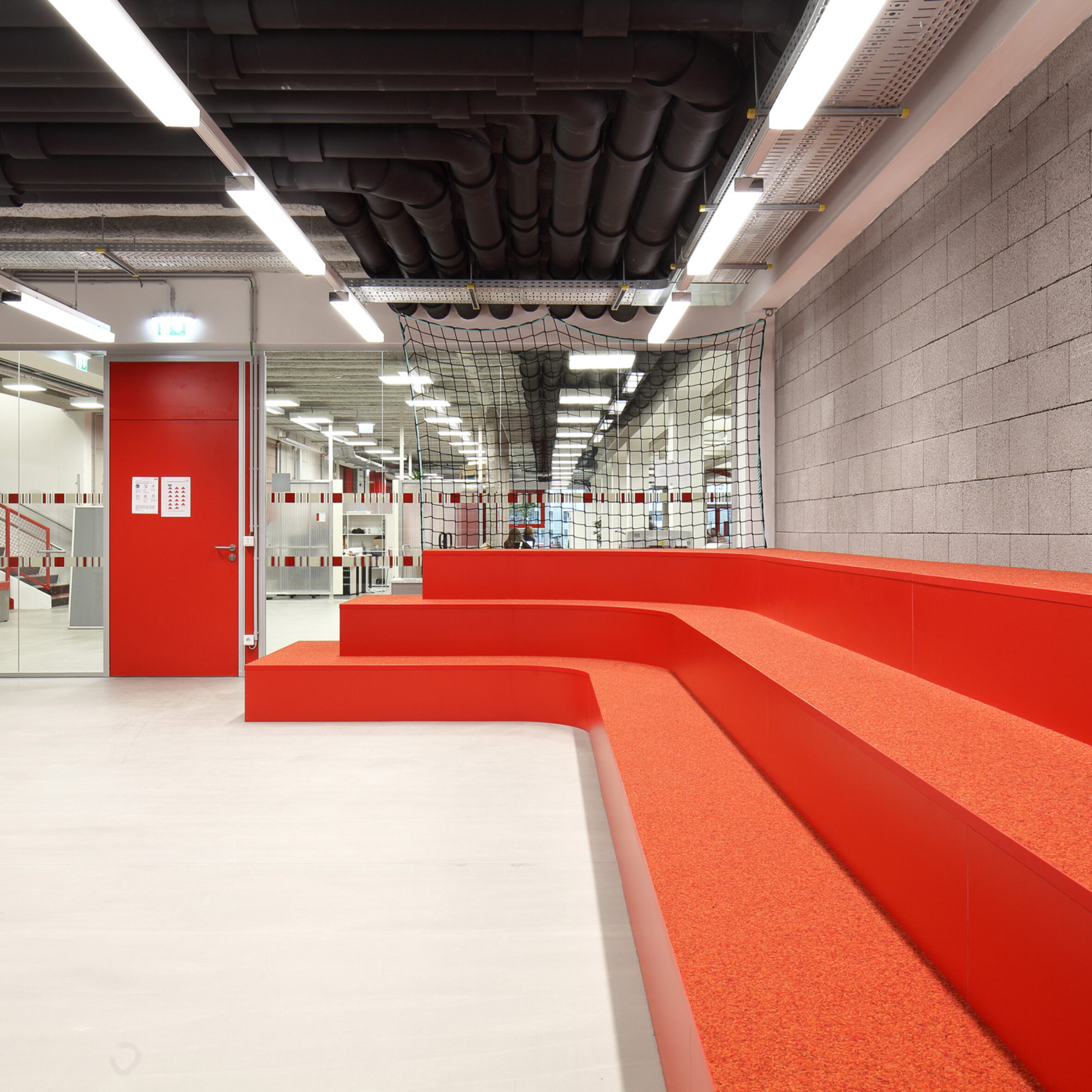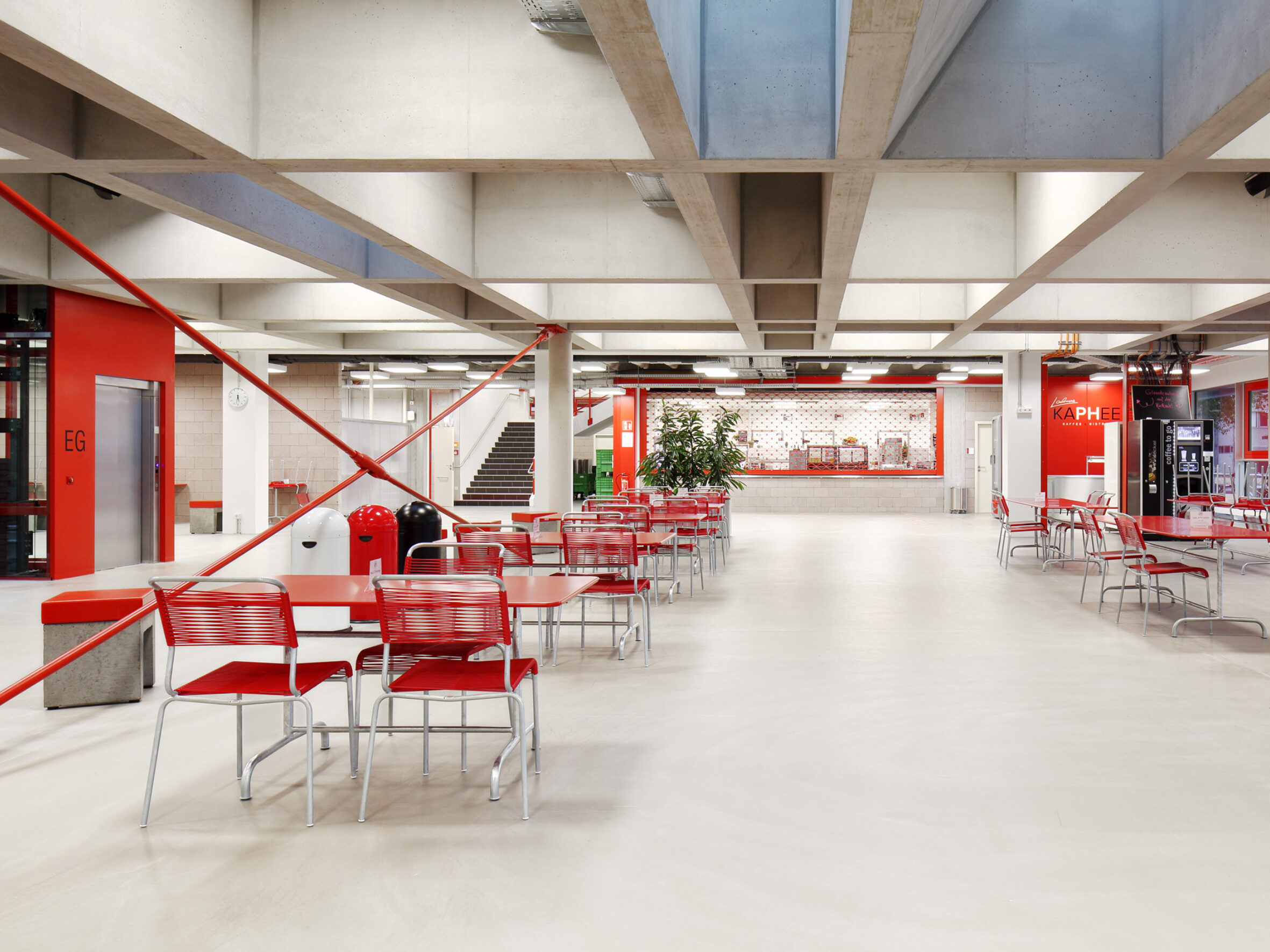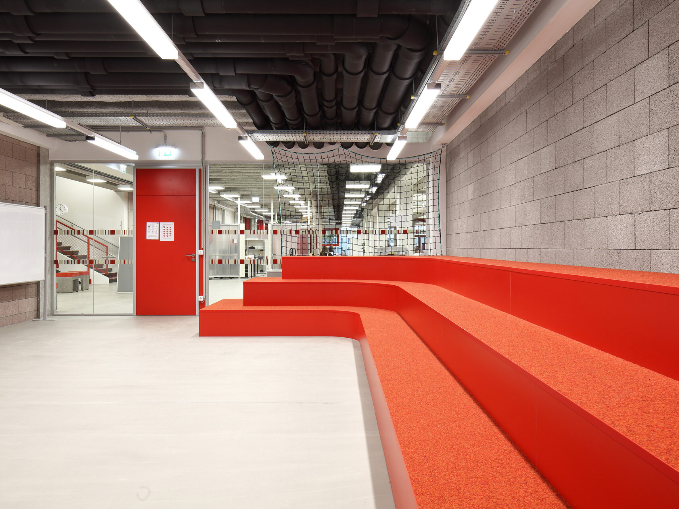 Die weißen, schwarzen und knallroten Pixel und Codes, die quer übers ganze Haus verstreut sind, kann man schön finden, muss man aber nicht. Auf jeden Fall aber bieten sie jede Menge Gesprächsstoff, denn die ungewöhnliche, energetisierende Farbgestaltung brachte die Hochschulleitung und die angehenden Pädagoginnen und Pädagogen schon lange vor Fertigstellung des Gebäudes in rege Diskussion: Was ist Ästhetik? Wie definiert sich Gemütlichkeit? Und wie sieht ein Raum aus, der die Lehrenden und Lernenden entzündet und inspiriert, anstatt ihnen einfach nur eine Hülle klassischer Geborgenheit zu bieten? „Gemeinsam mit der Jury haben wir uns für dieses Projekt entschieden, weil es der interessanteste Ansatz war, wie man mit dem Alten umgehen, es würdigen und dennoch neu weiterdenken kann“, sagt Wolfgang Mairhofer, Projektsteuerer bei der BIG. „Die Hochschulleitung war zunächst überrascht, nahm die Rohheit und Prozesshaftigkeit der Architektur dann aber sogar in ihr pädagogisches Konzept auf: Der Unterricht hat sich seitdem verändert, hat heute einen offenen, werkstattartigen Charakter.“ Die Pädagogische Hochschule Salzburg, Teil eines größeren Schulkomplexes im Salzburger Nonntal, wurde in den späten 1960er-Jahren errichtet und war bereits am Ende ihrer Kapazitäten. Die BIG untersuchte zwei Szenarien – einerseits Abbruch und Neubau, andererseits Sanierung und Erweiterung – und überlie. die Entscheidung letztendlich den 64 Teilnehmer*innen des EU-weiten Wettbewerbs. Die siegreichen riccione architekten entschieden sich für einen ganzheitlichen, nachhaltigen Ansatz: Die beiden Gebäudetrakte mit ihren charakteristischen Betonplatten an der Fassade wurden erhalten und im Zwischenraum mit einer Aula mit Lernzonen und abgesenktem Audimax für 400 Personen miteinander verbunden. Der Altbestand wurde entkernt, die Zwischendecken entfernt, übrig blieb eine rohe, archaische Struktur, die mit neuen Elementen befüllt wurde – mit nackten Ziegelsteinen, bunt gepixeltem PVC-Boden und transluzent eingehausten Nebenräumen und Besprechungszonen. Mit der Sanierung der Pädagogischen Hochschule zeigt die BIG vor, wie wir in Zukunft mit dem nicht immer hoch geschätzten baulichen Bestand aus den Nachkriegsjahren umgehen können. Und liefert zugleich ein wunderbares Praxisbeispiel für Kreislaufwirtschaft und sorgsamen Umgang mit Ressourcen. Und ja, das ist schön.