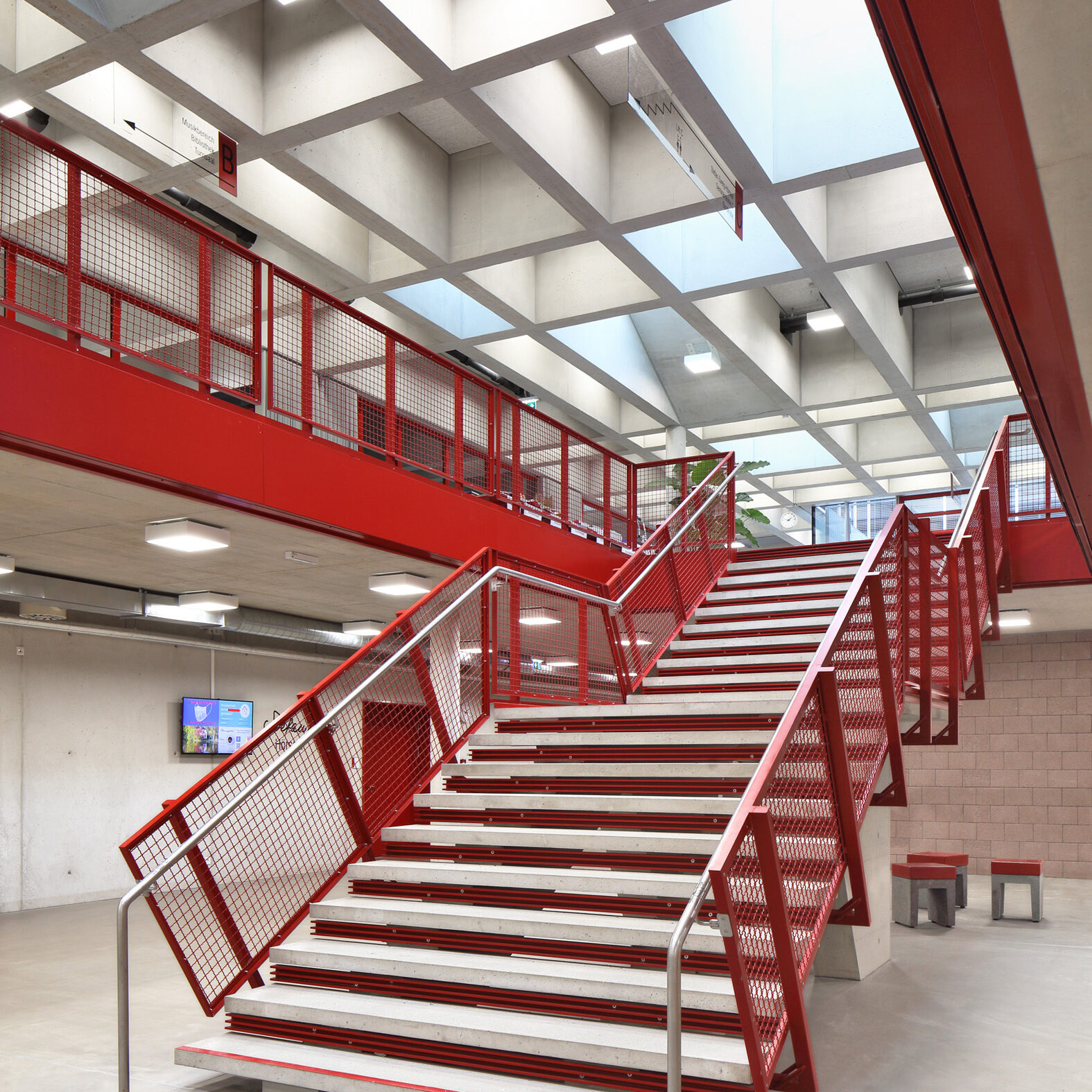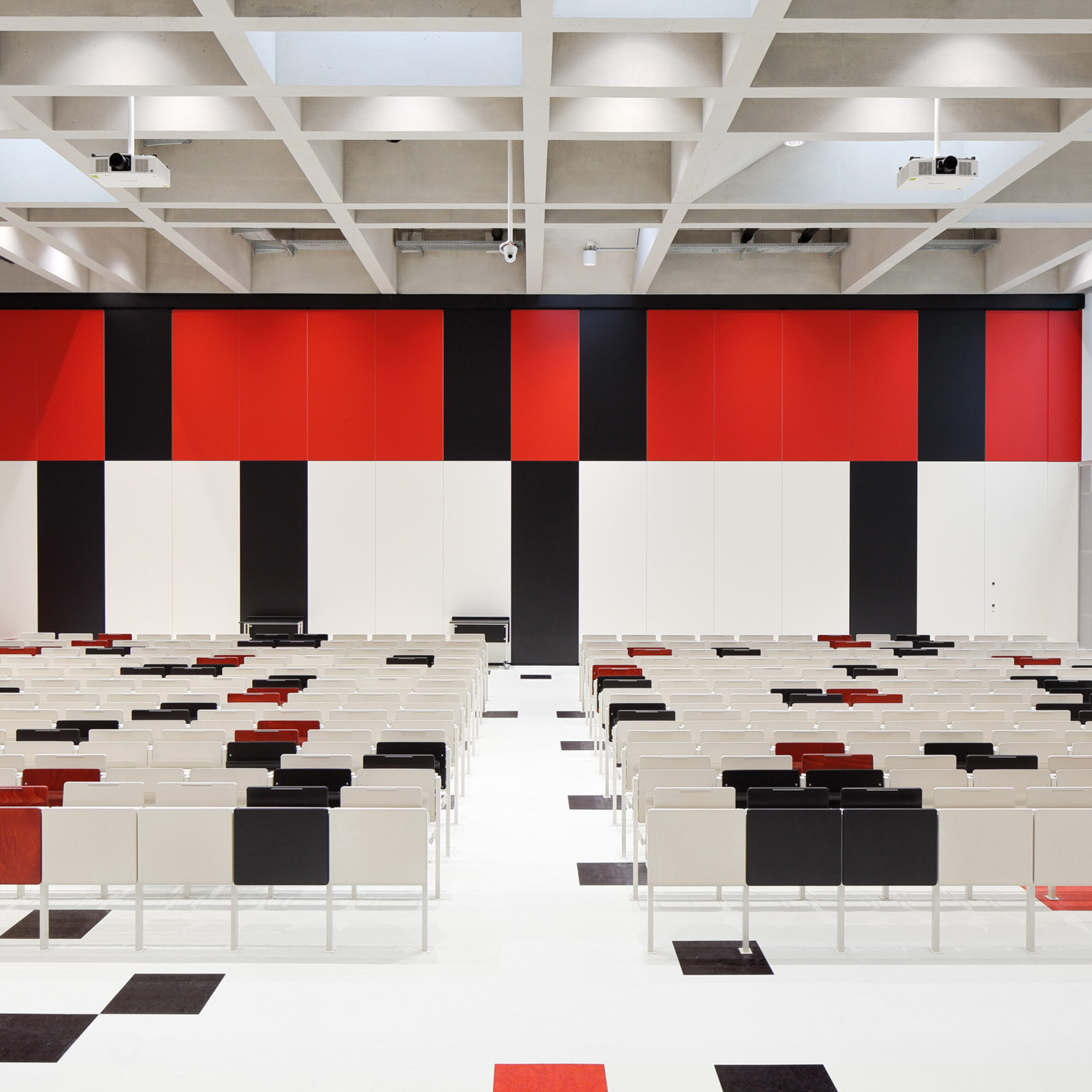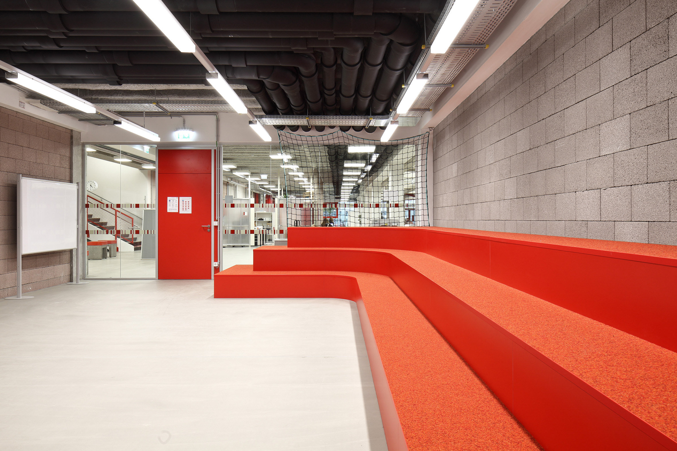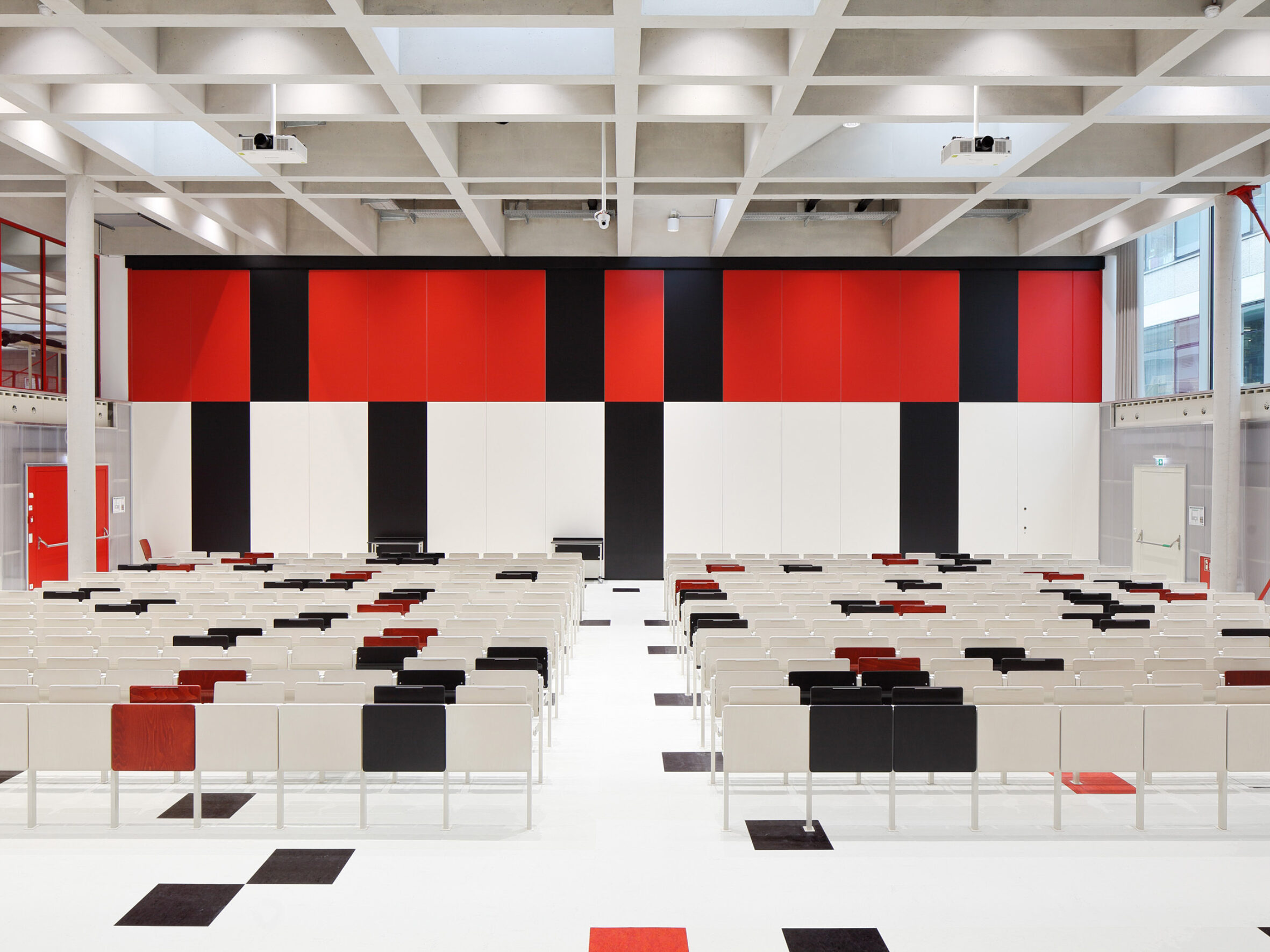 Die weißen, schwarzen und knallroten Pixel und Codes, die quer übers ganze Haus verstreut sind, kann man schön finden, muss man aber nicht. Auf jeden Fall aber bieten sie jede Menge Gesprächsstoff, denn die ungewöhnliche, energetisierende Farbgestaltung brachte die Hochschulleitung und die angehenden Pädagoginnen und Pädagogen schon lange vor Fertigstellung des Gebäudes in rege Diskussion: Was ist Ästhetik? Wie definiert sich Gemütlichkeit? Und wie sieht ein Raum aus, der die Lehrenden und Lernenden entzündet und inspiriert, anstatt ihnen einfach nur eine Hülle klassischer Geborgenheit zu bieten? „Gemeinsam mit der Jury haben wir uns für dieses Projekt entschieden, weil es der interessanteste Ansatz war, wie man mit dem Alten umgehen, es würdigen und dennoch neu weiterdenken kann“, sagt Wolfgang Mairhofer, Projektsteuerer bei der BIG. „Die Hochschulleitung war zunächst überrascht, nahm die Rohheit und Prozesshaftigkeit der Architektur dann aber sogar in ihr pädagogisches Konzept auf: Der Unterricht hat sich seitdem verändert, hat heute einen offenen, werkstattartigen Charakter.“ Die Pädagogische Hochschule Salzburg, Teil eines größeren Schulkomplexes im Salzburger Nonntal, wurde in den späten 1960er-Jahren errichtet und war bereits am Ende ihrer Kapazitäten. Die BIG untersuchte zwei Szenarien – einerseits Abbruch und Neubau, andererseits Sanierung und Erweiterung – und überlie. die Entscheidung letztendlich den 64 Teilnehmer*innen des EU-weiten Wettbewerbs. Die siegreichen riccione architekten entschieden sich für einen ganzheitlichen, nachhaltigen Ansatz: Die beiden Gebäudetrakte mit ihren charakteristischen Betonplatten an der Fassade wurden erhalten und im Zwischenraum mit einer Aula mit Lernzonen und abgesenktem Audimax für 400 Personen miteinander verbunden. Der Altbestand wurde entkernt, die Zwischendecken entfernt, übrig blieb eine rohe, archaische Struktur, die mit neuen Elementen befüllt wurde – mit nackten Ziegelsteinen, bunt gepixeltem PVC-Boden und transluzent eingehausten Nebenräumen und Besprechungszonen. Mit der Sanierung der Pädagogischen Hochschule zeigt die BIG vor, wie wir in Zukunft mit dem nicht immer hoch geschätzten baulichen Bestand aus den Nachkriegsjahren umgehen können. Und liefert zugleich ein wunderbares Praxisbeispiel für Kreislaufwirtschaft und sorgsamen Umgang mit Ressourcen. Und ja, das ist schön.