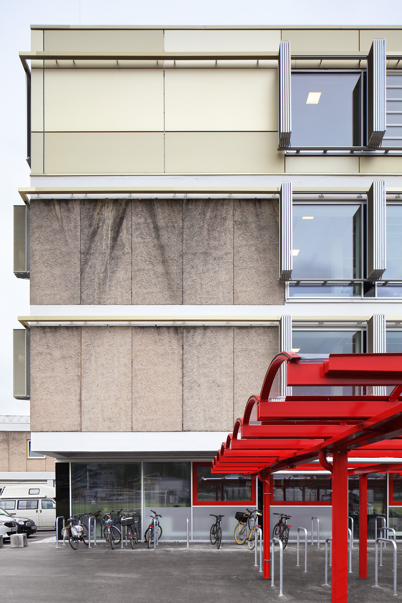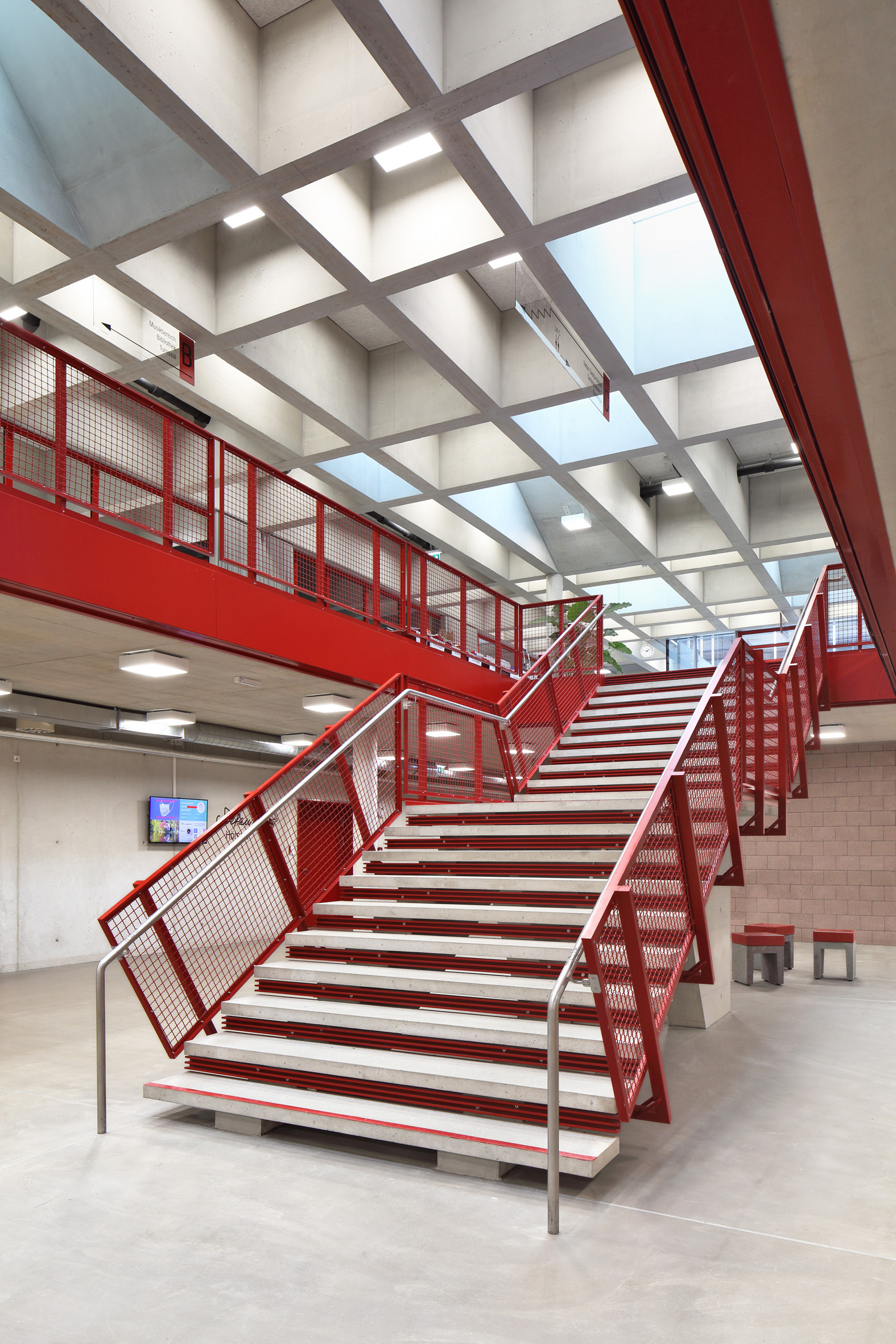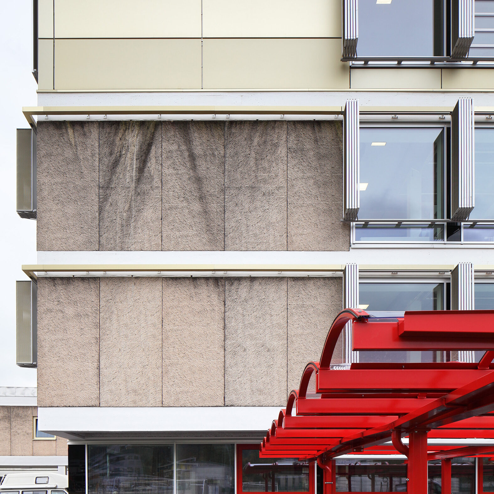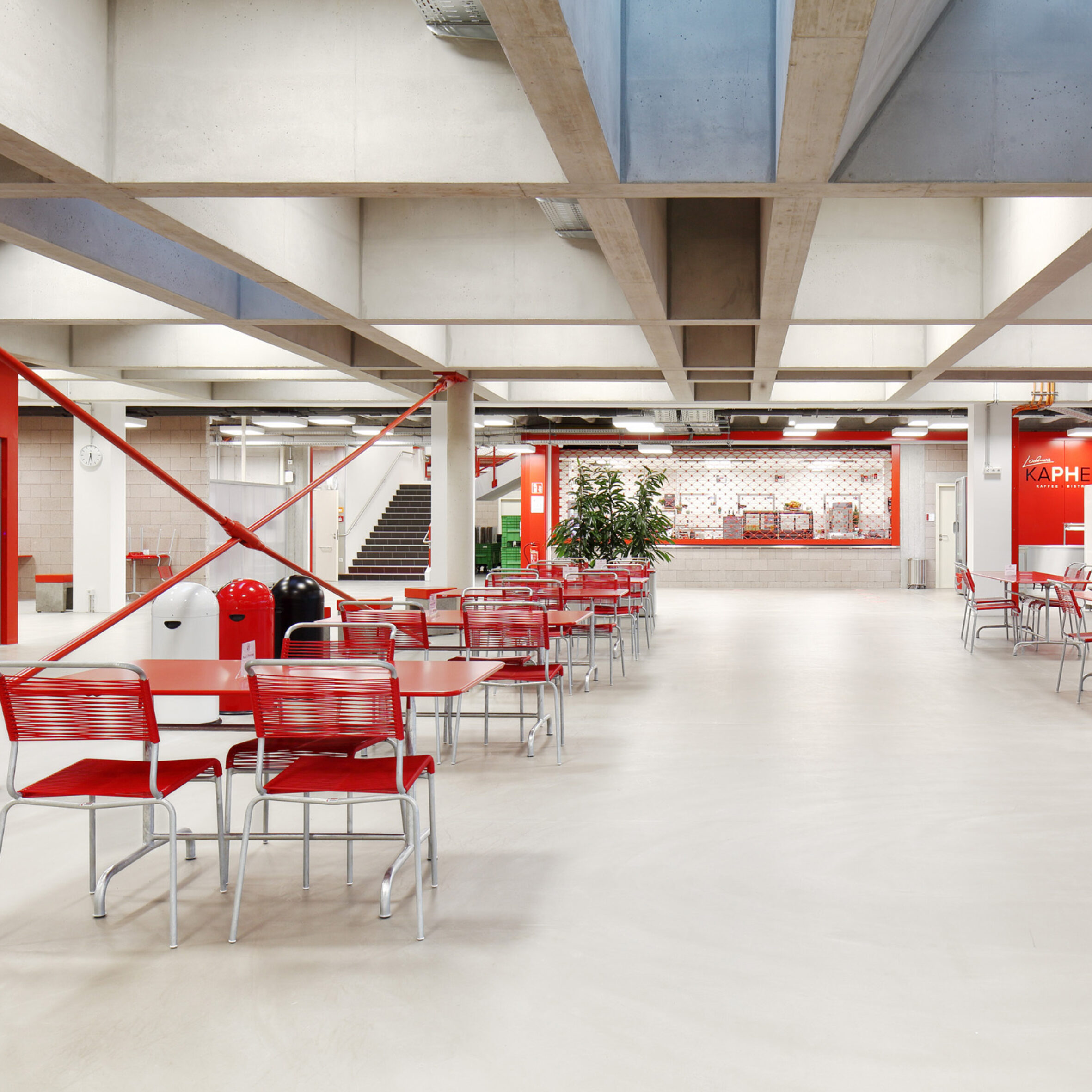 Die weißen, schwarzen und knallroten Pixel und Codes, die quer übers ganze Haus verstreut sind, kann man schön finden, muss man aber nicht. Auf jeden Fall aber bieten sie jede Menge Gesprächsstoff, denn die ungewöhnliche, energetisierende Farbgestaltung brachte die Hochschulleitung und die angehenden Pädagoginnen und Pädagogen schon lange vor Fertigstellung des Gebäudes in rege Diskussion: Was ist Ästhetik? Wie definiert sich Gemütlichkeit? Und wie sieht ein Raum aus, der die Lehrenden und Lernenden entzündet und inspiriert, anstatt ihnen einfach nur eine Hülle klassischer Geborgenheit zu bieten? „Gemeinsam mit der Jury haben wir uns für dieses Projekt entschieden, weil es der interessanteste Ansatz war, wie man mit dem Alten umgehen, es würdigen und dennoch neu weiterdenken kann“, sagt Wolfgang Mairhofer, Projektsteuerer bei der BIG. „Die Hochschulleitung war zunächst überrascht, nahm die Rohheit und Prozesshaftigkeit der Architektur dann aber sogar in ihr pädagogisches Konzept auf: Der Unterricht hat sich seitdem verändert, hat heute einen offenen, werkstattartigen Charakter.“ Die Pädagogische Hochschule Salzburg, Teil eines größeren Schulkomplexes im Salzburger Nonntal, wurde in den späten 1960er-Jahren errichtet und war bereits am Ende ihrer Kapazitäten. Die BIG untersuchte zwei Szenarien – einerseits Abbruch und Neubau, andererseits Sanierung und Erweiterung – und überlie. die Entscheidung letztendlich den 64 Teilnehmer*innen des EU-weiten Wettbewerbs. Die siegreichen riccione architekten entschieden sich für einen ganzheitlichen, nachhaltigen Ansatz: Die beiden Gebäudetrakte mit ihren charakteristischen Betonplatten an der Fassade wurden erhalten und im Zwischenraum mit einer Aula mit Lernzonen und abgesenktem Audimax für 400 Personen miteinander verbunden. Der Altbestand wurde entkernt, die Zwischendecken entfernt, übrig blieb eine rohe, archaische Struktur, die mit neuen Elementen befüllt wurde – mit nackten Ziegelsteinen, bunt gepixeltem PVC-Boden und transluzent eingehausten Nebenräumen und Besprechungszonen. Mit der Sanierung der Pädagogischen Hochschule zeigt die BIG vor, wie wir in Zukunft mit dem nicht immer hoch geschätzten baulichen Bestand aus den Nachkriegsjahren umgehen können. Und liefert zugleich ein wunderbares Praxisbeispiel für Kreislaufwirtschaft und sorgsamen Umgang mit Ressourcen. Und ja, das ist schön.