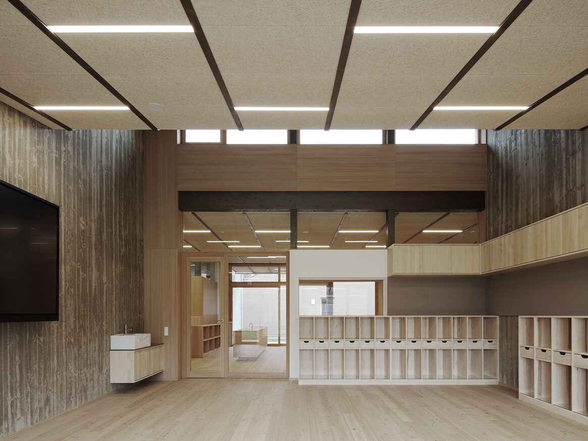 Eine Klasse in Esche, eine in Ahorn, eine in Tanne und eine besonders wohlduftende in Zirbe. Mit der starken, raumweisen Differenzierung der Möbel- und Wandhölzer ist es gelungen, möglichst viele regionale, zertifizierte Holzarten zu verbauen, ohne dabei ein wildes Sammelsurium zu erschaffen. „Und das Schöne ist“, sagt Schuldirektorin Maria-Magdalena Wiery, „dass die Schülerinnen und Schüler von Klasse zu Klasse weiterwandern und auf diese Weise jedes Jahr ein neues Holz kennenlernen. Auf das Zirbenjahr freuen sich alle am meisten!“ Die Volksschule Hörzendorf in St. Veit an der Glan ist in ganz Kärnten die erste Ganztagsvolksschule in verschränkter Abfolge. Das heißt: Schulstunden, selbstständiges Lernen und Freizeit-Einheiten sind über den ganzen Tag verstreut. Im Vordergrund steht die möglichst selbstständige, selbstermächtigte Gestaltung des Wohnens, Spielens und Lernens. Dieses pädagogische Konzept, das die Schulleiterin mit ihrem Team erstellte, bildete schließlich die Basis für den Architektur-Wettbewerb. Die siegreiche Kärntner Architektin Eva Rubin entwickelte ein Schulhaus auf Augenhöhe der Kinder – mit schöner Lichtführung, niedrigen Fensterparapeten, haptisch angenehmen Fußböden, unverputzten Betonwänden zum Anfassen und vielen gemütlichen Ecken zum Nichtstun und Verkriechen. Man fühlt sich auf Anhieb wohl und verspürt den plötzlichen Drang, nochmal das ABC und das Einmaleins des Lebens lernen zu wollen.
