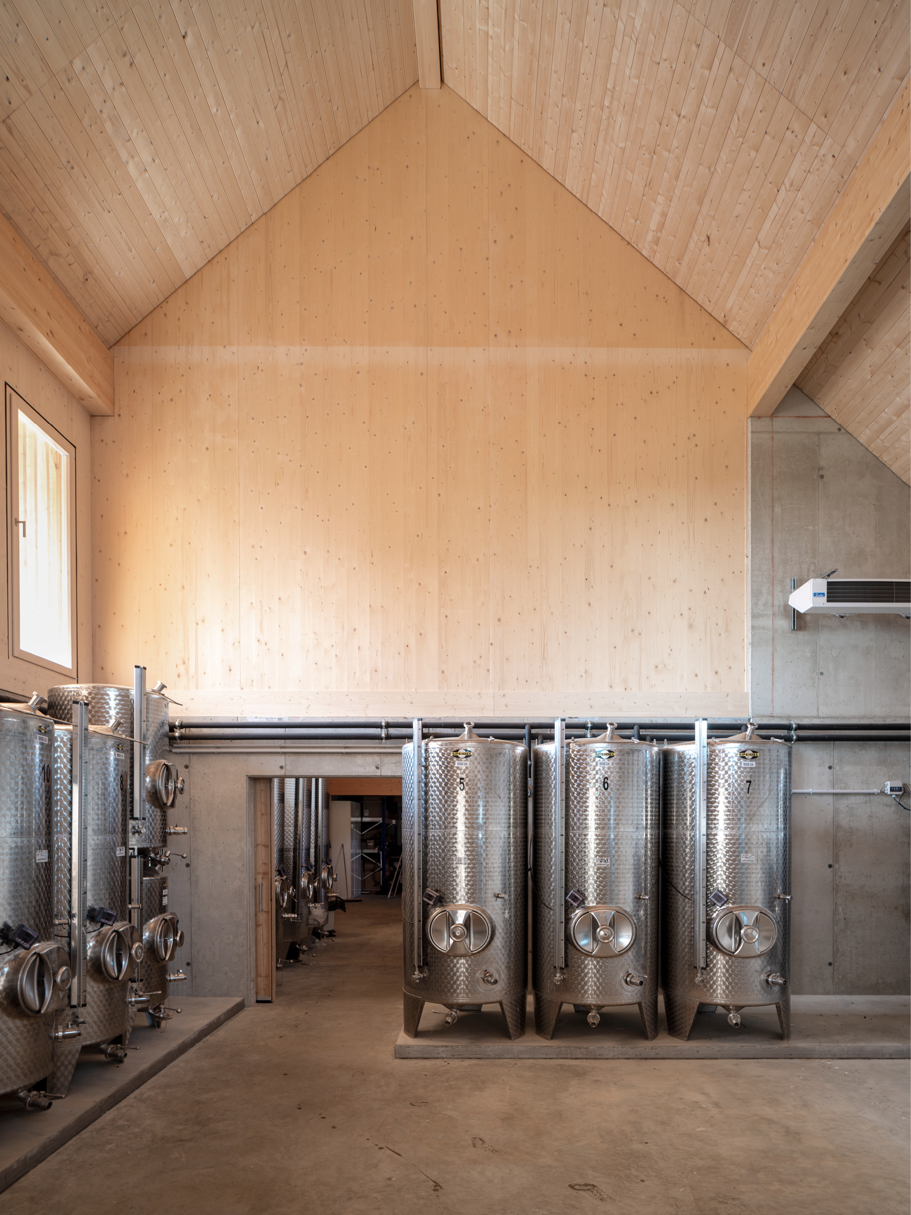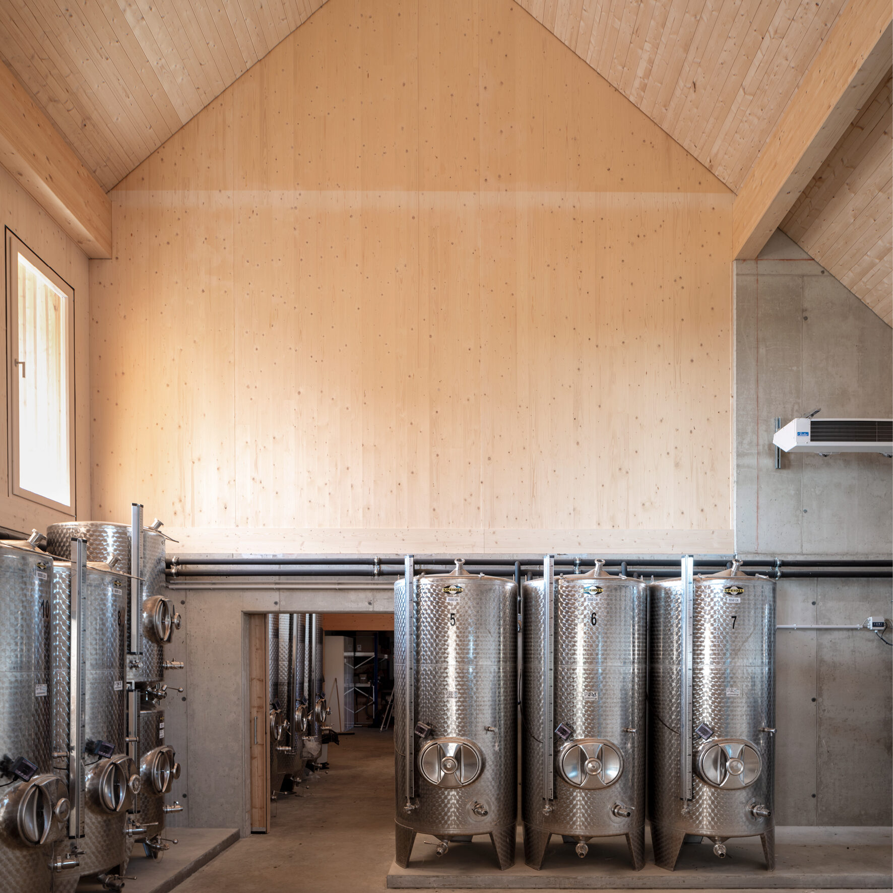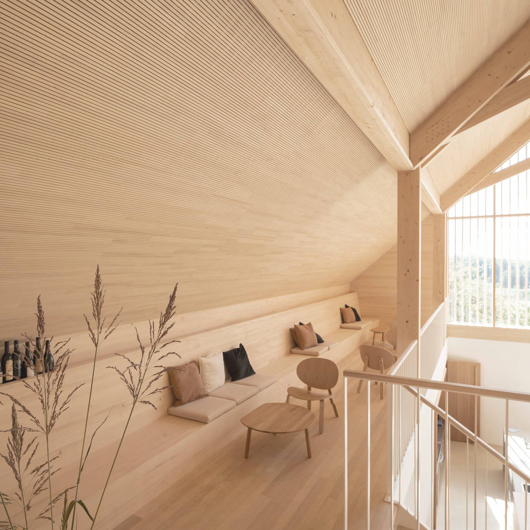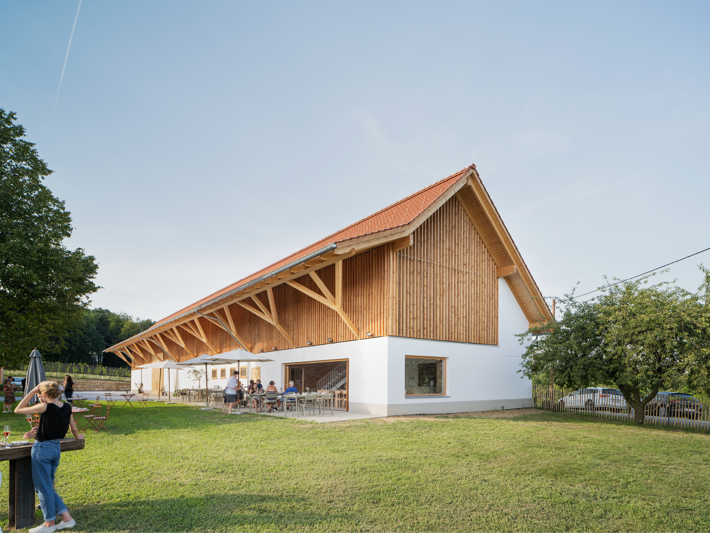 Er hat noch nie zuvor ein Bauprojekt in Auftrag gegeben. Sie hat noch nie zuvor etwas gebaut, war nicht einmal noch mit ihrem Architekturstudium fertig. Die Geschichte lehrt uns, dass dies kein Hinderungsgrund sein muss. Denn was als Zufallsbekanntschaft und wagemutiges Gedankenexperiment bei einem Abendessen in einer Berliner WG seinen Anfang an, entwickelte sich im Laufe der darauffolgenden Monate und Jahre zu einem Beispiel dafür, wie man einen teils revitalisierten, teils neu errichteten Produktionsbetrieb passgenau in die südoststeirische Landschaft hineinsetzen kann. Bauherr Lukas Jahn (29) und Architektin Mascha Ritter (28) entschieden sich, einen kleinen, intakten Teil des bestehenden Kuhstalls zu erhalten und sich bei den neuen Zu- und Anbauten an der Silhouette des bisherigen Wirtschaftsgebäudes zu orientieren. Das Resultat ist eine auf den ersten Blick symbiotische Zusammenführung aus Alt und Neu – und eine auf den zweiten Blick überaus sensible Neuinterpretation der regionalen Bautypologien und des lokalen Handwerks, die man mit Freude begutachten und einfach nur streicheln will. Im Norden des 50 Meter langen Gebäudes befindet sich die Verarbeitung samt Pressbereich und Kühlhaus, in der Mitte ist der Weinkeller mit Verkaufund Verkostungsbereich untergebracht, im südlichen Ende schließlich befindet sich die Buschenschank, für die Lukas Jahn sogar ein eigenes Gastronomiekonzept entwickelt hat: Als Begleitung zu den Weinen werden regionale Tapas serviert, wobei der Fleischanteil lediglich 30 Prozent beträgt, der Rest ist vegetarisch und vegan. Die Nachhaltigkeit bezieht sich nicht nur auf die Wein- und Speisekarte, sondern zeigt sich auch im Einsatz von Holz, in der intensiven Zusammenarbeit mit lokalen Handwerkern, im generellen Verzicht auf Kunststoffe im ganzen Haus, in der Errichtung einer unterirdischen Regenwasserzisterne für die Bewässerung der Weinreben sowie im wunderschönen zimmermannsmäßigen Dachstuhl mit seinen Hunderten Stabdübeln. „Wir haben sogar ein aufgeklapptes Vordach errichtet, wie man das früher gemacht hat, und einen Grean gebaut“, sagt Lukas Jahn. Und erklärt, dass der Grean traditionell den betonierten Vorplatz auf der Südseite des Wirtschaftshofs bezeichnet. Anekdotenreiche Details wie diese gibt es viele zu entdecken. Bauherr und Architektin waren ein Dream Team und haben mit ihrem Erstlingswerk bewiesen, dass man auch mit wenig Praxiserfahrung einen Beitrag zur Regionalität leisten und Baukultur auf höchstem Niveau leben kann.