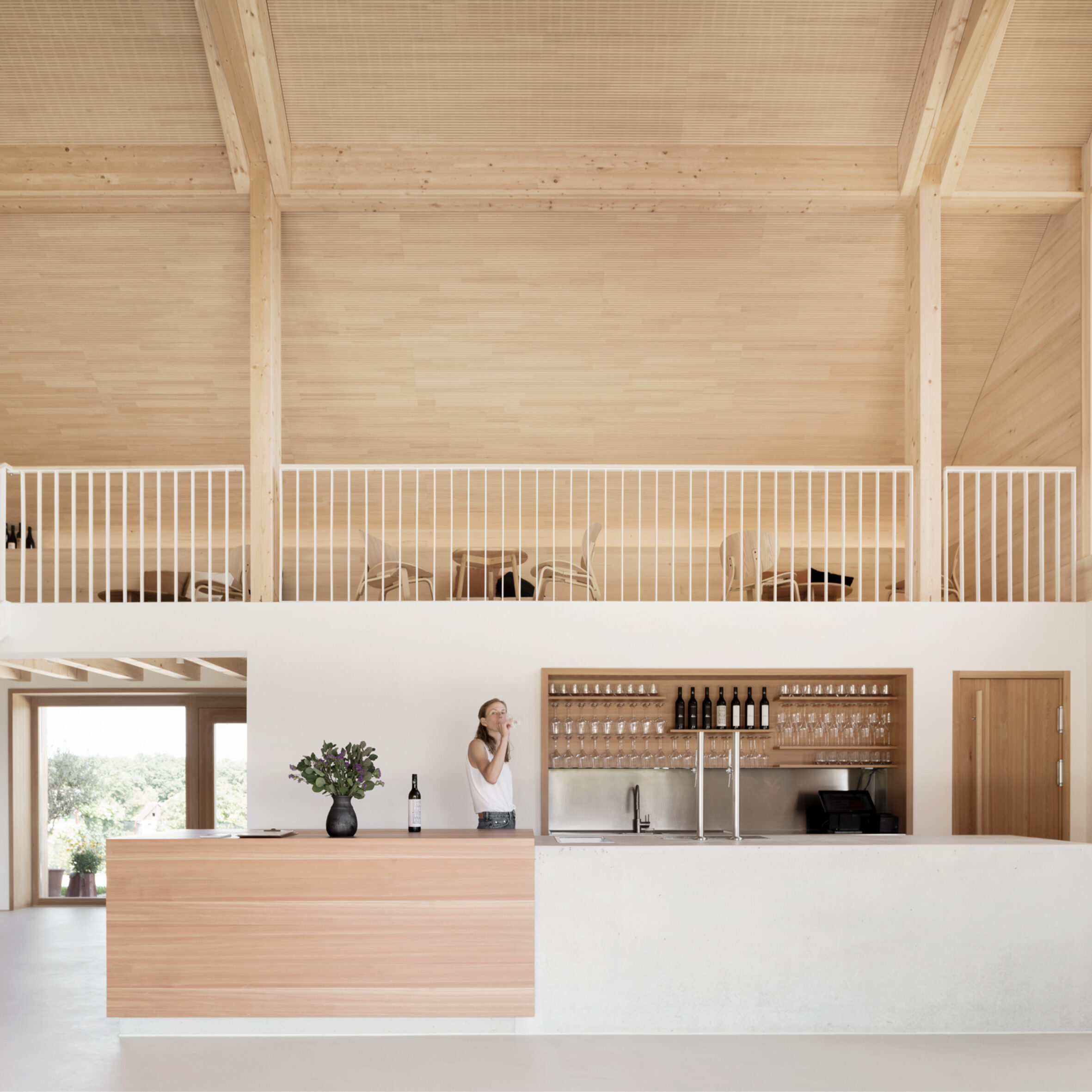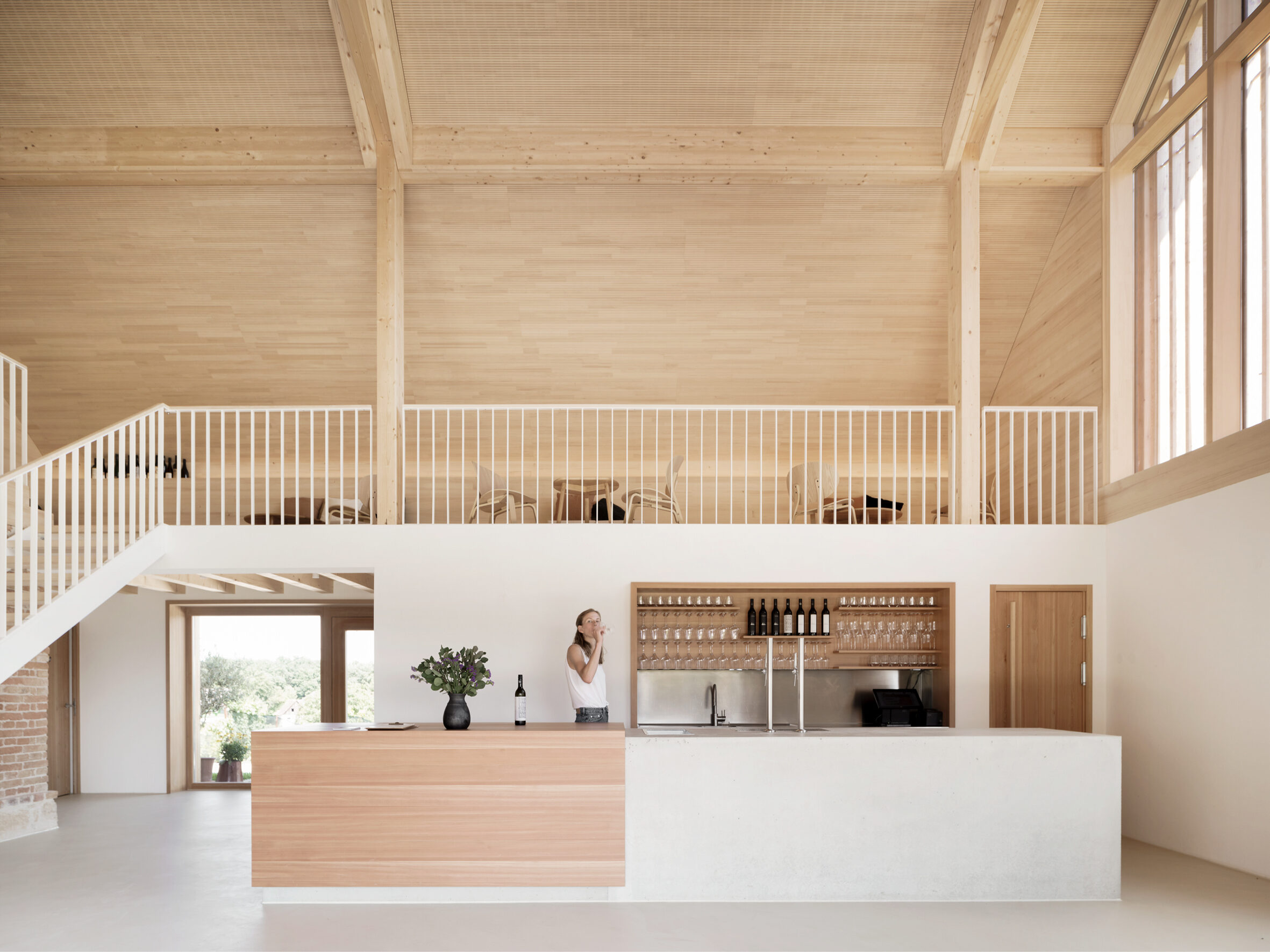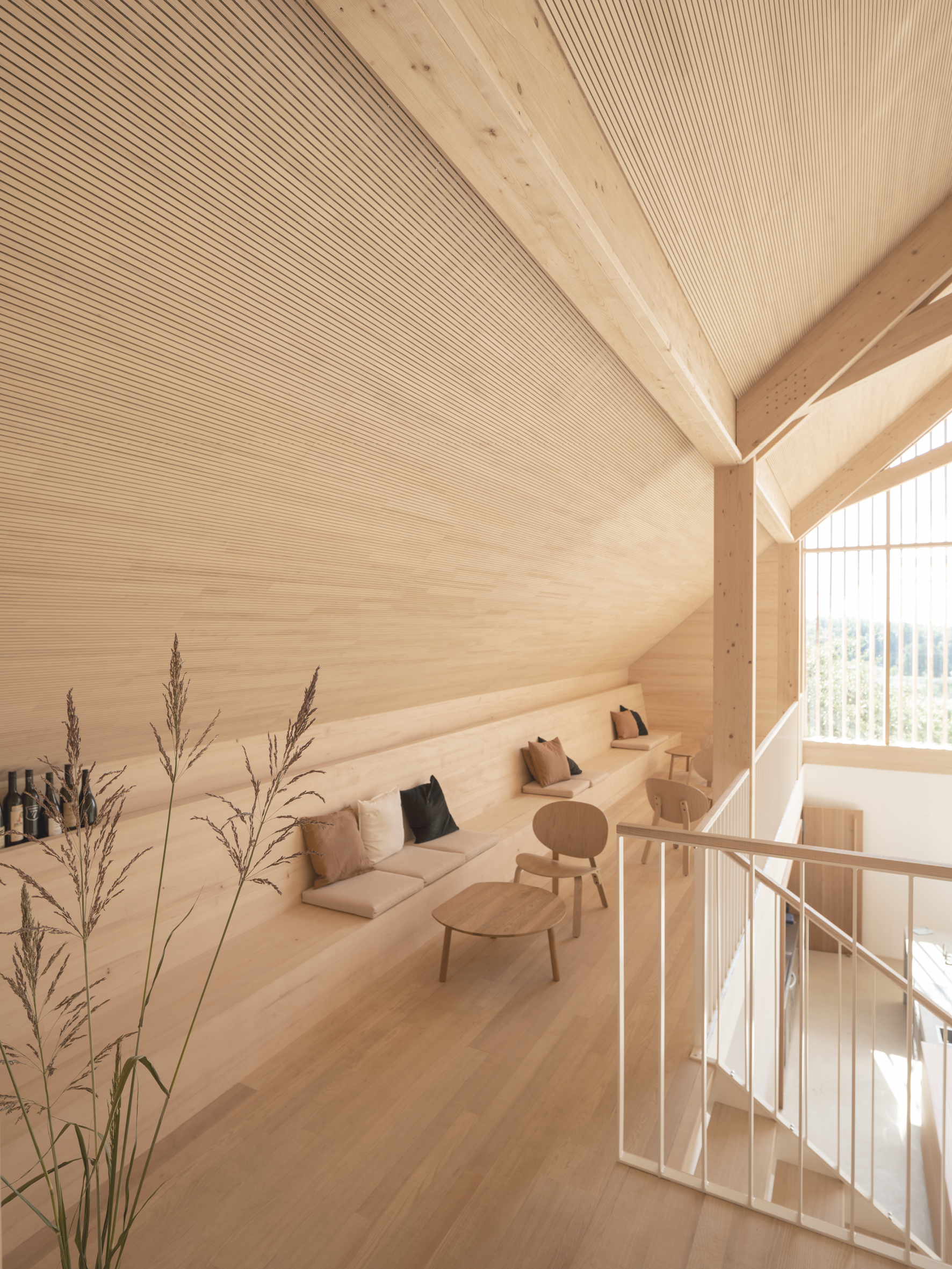 Er hat noch nie zuvor ein Bauprojekt in Auftrag gegeben. Sie hat noch nie zuvor etwas gebaut, war nicht einmal noch mit ihrem Architekturstudium fertig. Die Geschichte lehrt uns, dass dies kein Hinderungsgrund sein muss. Denn was als Zufallsbekanntschaft und wagemutiges Gedankenexperiment bei einem Abendessen in einer Berliner WG seinen Anfang an, entwickelte sich im Laufe der darauffolgenden Monate und Jahre zu einem Beispiel dafür, wie man einen teils revitalisierten, teils neu errichteten Produktionsbetrieb passgenau in die südoststeirische Landschaft hineinsetzen kann. Bauherr Lukas Jahn (29) und Architektin Mascha Ritter (28) entschieden sich, einen kleinen, intakten Teil des bestehenden Kuhstalls zu erhalten und sich bei den neuen Zu- und Anbauten an der Silhouette des bisherigen Wirtschaftsgebäudes zu orientieren. Das Resultat ist eine auf den ersten Blick symbiotische Zusammenführung aus Alt und Neu – und eine auf den zweiten Blick überaus sensible Neuinterpretation der regionalen Bautypologien und des lokalen Handwerks, die man mit Freude begutachten und einfach nur streicheln will. Im Norden des 50 Meter langen Gebäudes befindet sich die Verarbeitung samt Pressbereich und Kühlhaus, in der Mitte ist der Weinkeller mit Verkaufund Verkostungsbereich untergebracht, im südlichen Ende schließlich befindet sich die Buschenschank, für die Lukas Jahn sogar ein eigenes Gastronomiekonzept entwickelt hat: Als Begleitung zu den Weinen werden regionale Tapas serviert, wobei der Fleischanteil lediglich 30 Prozent beträgt, der Rest ist vegetarisch und vegan. Die Nachhaltigkeit bezieht sich nicht nur auf die Wein- und Speisekarte, sondern zeigt sich auch im Einsatz von Holz, in der intensiven Zusammenarbeit mit lokalen Handwerkern, im generellen Verzicht auf Kunststoffe im ganzen Haus, in der Errichtung einer unterirdischen Regenwasserzisterne für die Bewässerung der Weinreben sowie im wunderschönen zimmermannsmäßigen Dachstuhl mit seinen Hunderten Stabdübeln. „Wir haben sogar ein aufgeklapptes Vordach errichtet, wie man das früher gemacht hat, und einen Grean gebaut“, sagt Lukas Jahn. Und erklärt, dass der Grean traditionell den betonierten Vorplatz auf der Südseite des Wirtschaftshofs bezeichnet. Anekdotenreiche Details wie diese gibt es viele zu entdecken. Bauherr und Architektin waren ein Dream Team und haben mit ihrem Erstlingswerk bewiesen, dass man auch mit wenig Praxiserfahrung einen Beitrag zur Regionalität leisten und Baukultur auf höchstem Niveau leben kann.